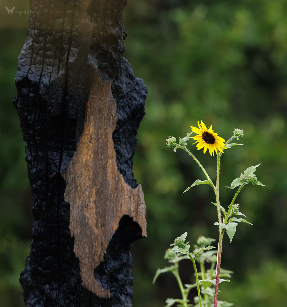 Wild sunflowers blooming at a burn site, summer 2025